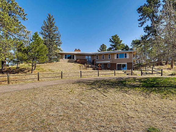 Situated on perhaps the most scenic acreage above Parker, this bright and spacious ranch offers mountain sunsets and 360-degree views of its mature Ponderosa pines and local population of Mule deer. It's a true oasis from the city, but just minutes away from E-470, the Denver Tech Center and downtown Parker.The main living area is open and features two wood-burning fireplaces. The great room and eat-in kitchen flow into the formal dining area and on to the newly renovated sun porch. Other upstairs amenitis include a master bedroom with private bath, built-in dresser and his-and-her closets, a second bedroom with walk-in closet, full bath, large laundry room, pantry, coat and linen closets.Downstairs you'll find a sizable entertainment room with a bar and walk-out patio, the third bedroom and bath, and a utility room with generous storage. Two of the three bathrooms are recently remodeled, and the complete interior is freshly painted and carpeted.Three outbuildings include an over-size, two-car garage with a separate workshop or storage area, a custom two-stall barn with feed and tack rooms, and a chicken coop. Bring your toys and your horses!