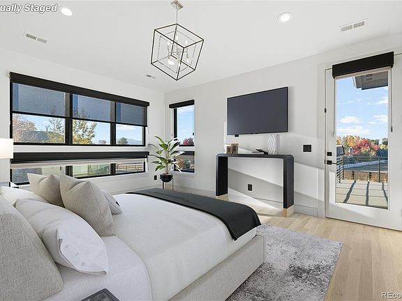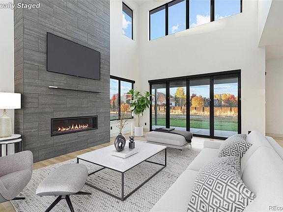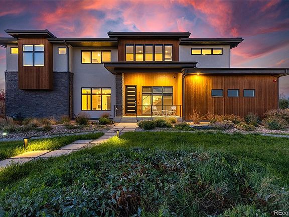 Experience unparalleled luxury in this stunning contemporary residence, set on nearly 1 acre of beautifully landscaped grounds with captivating views of Longs Peak. This immaculate home features high-end finishes throughout, creating a sunlit oasis that redefines modern living. The entry welcomes you with massive windows that bathe the interior in natural light, showcasing the exquisite White Oak hardwood flooring & soaring double-height ceilings in the family room, anchored by a striking floor-to-ceiling fireplace. The gourmet kitchen is equipped with custom cabinetry, premium stainless steel appliances, & a spacious walk-in pantry. The elegant quartz countertops, complemented by an oversized island featuring a waterfall edge, make this space perfect for both everyday living & entertaining. The seamless integration of custom NanaWall sliding glass doors opens to a serene backyard patio, creating an inviting indoor-outdoor flow. The main floor offers a private suite with direct access to the backyard, complete with a walk-in closet & ensuite bathroom. Upstairs, find a loft area & 4 additional bedrooms, including a lavish primary suite. This private retreat features a walk-in closet, a luxurious 5-piece bathroom, & an expansive deck showcasing breathtaking mountain vistas. Two of the additional bedrooms are thoughtfully designed with a Jack & Jill bathroom, while the 4th boasts its own ensuite. The finished basement provides a cozy lounge, an additional bedroom, & a bathroom. The peaceful backyard is an entertainer's paradise, featuring a covered patio, a fire pit, a garden area, & ample open space with meandering paths that invite exploration. Additional highlights include a 3-car garage with 3 EV ports & seller-owned solar panels. Located just 10 minutes from Boulder, this exquisite property presents a rare opportunity to own a truly exceptional home that embodies luxury living at its finest. Don’t miss your chance to experience this one-of-a-kind masterpiece!