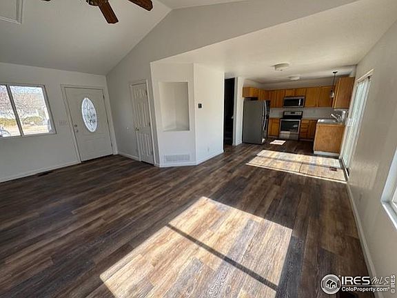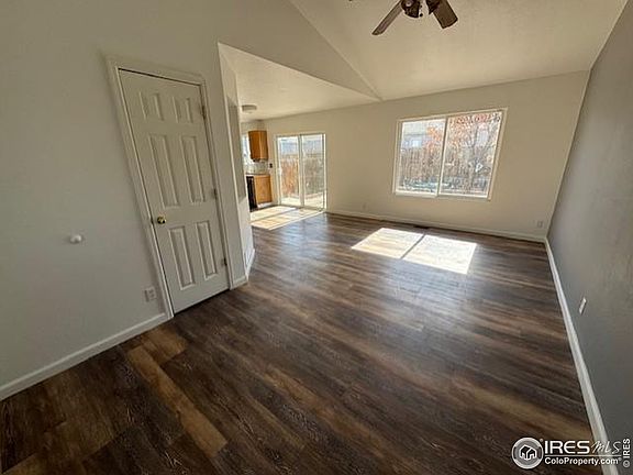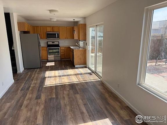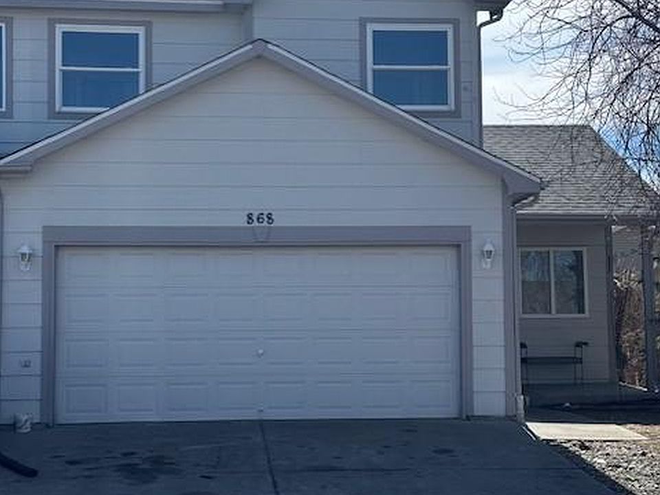 This two-story half duplex features a welcoming front porch that invites you in. Once inside, you will find an open floorplan with vaulted ceiling in the living room, nice kitchen with ample cupboard space and a half bath off the dining room. Southerly facing windows bring in lots of natural light with warmth and coziness. Sliding glass door off dining room leads to a spacious back patio, perfect for entertaining! Recent upgrades to this home include new laminate flooring on the main level, new carpet in all three upstairs bedrooms and fresh paint throughout! Primary has a walk-in closet and there's also a shared full bath upstairs as well. The full unfinished basement has many possibilities for customization. Fenced backyard offers privacy and has a small storage shed to store all your yard and garden tools! This home is move-in ready! Schedule your showing today!