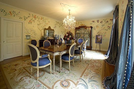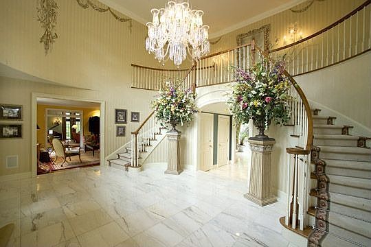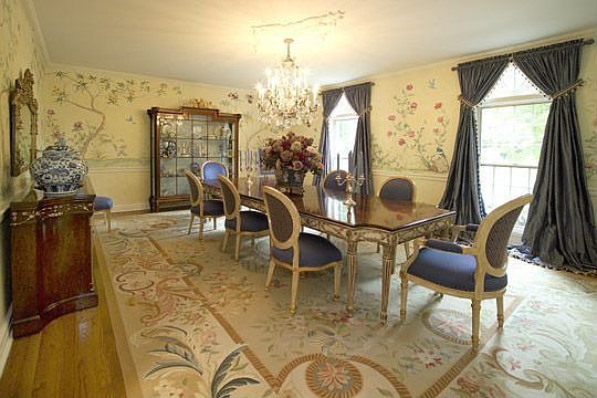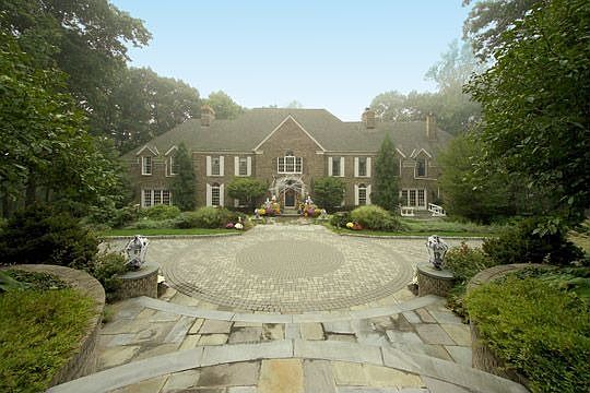 This Brick Manor home is beautifully set on 6 acres of professionally landscaped grounds with an inground pool and tennis court. Stones walls, walkways and circular paver driveway with extensive landscape lighting enhance the property. The elegant 2 story foyer with a bridal staircase with custom handpainted walls, trim and detail and is further enhanced by a marble floor. The foyer flows into the rear solarium room with a marble floor, walls of windows and doors opening to the stone patio overlooking the property. The formal Living room with wood floors opens to the 2 story Great Room with floor to ceiling stone fireplace and upper balcony. French doors open to a front stone patio, and walls of windows in the room create a beautiful frame for the lovely views of the property. The great room opens to a media room with a fireplace and a wet bar ideal for entertaining and enjoying full screen movies. The Formal dining room is banquet sized with handpainted walls and wood floors. The custom kitchen is spacious with handpainted cabinets, tile floor and a huge dining area with walls of windows and doors opening to the stone patio. The first floor library has a fireplace and built in cabinetry, and doors to a front stone patio. The formal powder room is a treat with handpainted wall details, marble floors and Sheryl Wagner pedestal sink. The back hallway has a second staircase to the second floor.