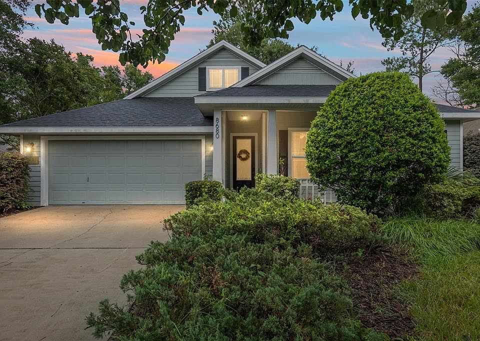 Welcome home to Longleaf! This cute 4-bedroom, 2-bathroom home with 1896 SF is located in the conveniently located southwest Gainesville neighborhood of Longleaf, which features LOW HOA fees at under 125/mo, for front lawn maintenance and access to the community amenities complete with a beach-entry pool, a kiddie splash pad, fitness center, basketball courts, tennis courts, and playground. This Tommy Williams built home has a charming front porch ready for your rocking chairs. This flexible floorplan features a three-way split plan with two guest rooms off the foyer, both of which overlook the front yard. The two guest rooms share a full hallway bath. This open plan has the family room as the center of the home, with the eating area and kitchen adjacent to it. Use the 4th bedroom (with closet) that is off the family room and kitchen area as your third guest bedroom, home office, homeschooling area or as a bonus room/flex space. The kitchen has 42” real wood cabinetry, a center prep island, a corner pantry, and a window over the kitchen sink. The countertops are pretty granite, and all of the stainless-steel appliances convey with the home. The master bedroom is located just passed the laundry room. This primary suite has two walk-in closets and a spacious master bathroom with a walk-in shower, a jetted tub and double sinks. The foyer and living space features wood-look wide plank tile floors, and the bedrooms carpet. Enjoy the north-facing screened enclosed lanai year-round. The rear yard is fully fenced. Additional features include 10 ft ceilings, bright natural lighting, a connecting laundry room to the 2-car garage, a 2018 HVAC system, a brand new roof as of July 2024, a 2021 40g gas water heater, the washer/dryer convey at time of closing, and Clay Electric for utilities. Located less than 10 minutes from the Publix shopping plaza where you will find local restaurants and shopping, Longleaf also has good proximity to University of Florida, Santa Fe College, UF Health, HCA Florida North Florida Hospital, Butler Plaza and Celebration Pointe.