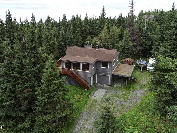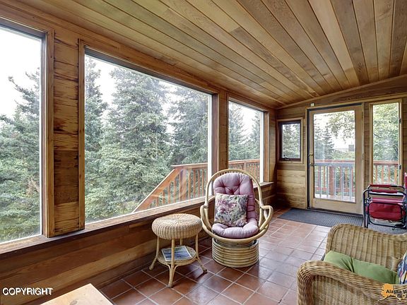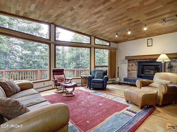 Charming hillside home steps from trails into Chugach Park. This home features a sun soaked solarium, open upstairs living w/ vaulted ceilings & woodstove insert fireplace. Technically a 2 bedroom but feels much more like 3. Surrounding trees make this large lot feel secluded while providing year round mtn views & winter peekaboo inlet views. Sauna is the perfect retreat after your hike/ski/bike!