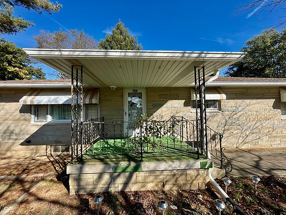 Bedford Stone home has 2 bedrooms one and a half baths with a 2 car detached garage has been freshly painted. The heart of this single-family residence undoubtedly lies in its well-appointed kitchen, where culinary adventures await, complete with a stylish backsplash, a practical kitchen peninsula, and a convenient kitchen bar, perfect for casual dining or entertaining; the double oven and stovetop stand ready to assist with any scale of cooking or baking. In the living room, the eye is drawn to the rich detail of the wood wall, creating a warm and inviting atmosphere. Step outside onto the patio and envision relaxing evenings spent enjoying the fresh air, or unwind on the porch, a perfect spot for morning coffee or watching the world go by. This property offers the convenience of one full bathroom and one half bathroom, thoughtfully designed for everyday living. Full basement features the game room, workshop, utility room and storage room. City water, high speed internet. Sidewalks and an asphalt driveway.
