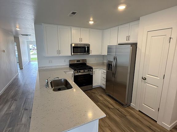 The heart of the home shines with elegance: enjoy gleaming quartz countertops and backsplashes, accented by Moen faucets and white Shaker-style cabinetry. Luxury vinyl plank flooring flows throughout, complemented by stainless-steel appliances and full landscaping. Key conveniences like a refrigerator, washer/dryer, and window blinds are included for seamless living.