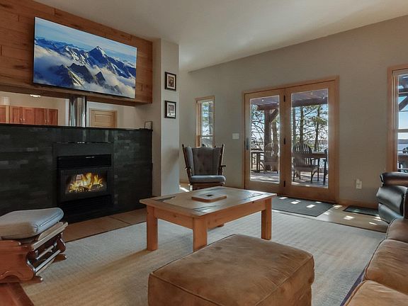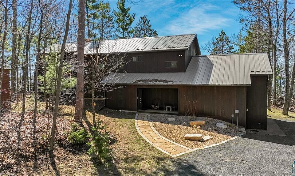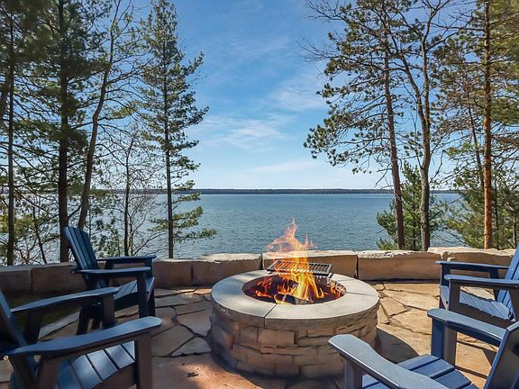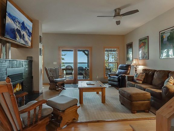Grindstone Lake home with 170’ of sandy shoreline, incredible sweeping views, end-of-the-road privacy, and situated on just under one acre of wooded land. Step inside to discover a stunning interior featuring oak flooring, cherry kitchen cabinetry, a double-sided wood-burning fireplace, solid oak doors, and a spacious loft area, currently utilized as a third bedroom which offers versatile living options. A spacious lakeside deck with a charming pergola, an ideal spot for entertaining or simply unwinding amidst nature's beauty. Additional amenities include in-floor heating, an insulated and heated 2-car garage, 3 mini split air conditioners, beautifully landscaped grounds and a picturesque lakeside fireplace. Enjoy the waterfront via stairs or effortless access on the tram. This home comes furnished, ensuring a seamless transition into your lakeside paradise. Bonus – it also includes the dock and two Hewitt boat lifts powered by solar electricity.