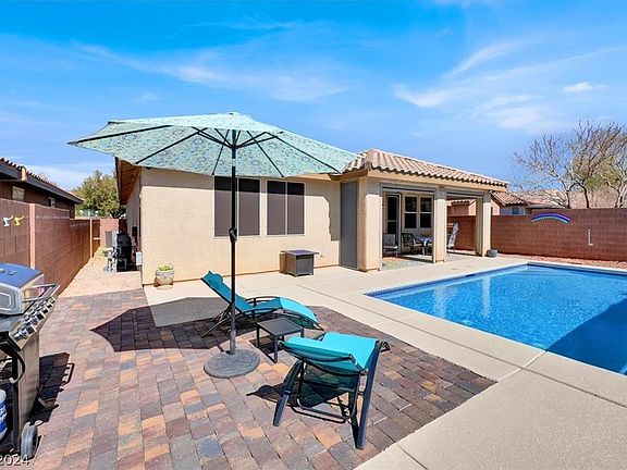 Absolutely stunning Mountains Edge single story home - a real unicorn in this market! This one has everything you've been looking for - gated community, single story, 3bd Plus Den, 3ba 2 car garage, Great room w/ fireplace, open concept kitchen with spacious breakfast bar, Entertainers Dream Back Yard including Refreshing Pool just in time for Summer, covered patio featuring remote control shades on all sides so you can sit back, relax and enjoy your outdoor space! Kitchen featuring Granite countertops & pantry, all SS appliances. Primary suite is separate from secondary bedrooms and has wood laminate floors, ceiling fan and backyard patio access. Enjoy single story living at it's finest in this highly sought after Mountains Edge neighborhood! Close to walking trails, parks, shopping, dining, schools, freeway access and the newly opened Durango Station Resort and Casino. This upscale 3bd 3 ba home has it all - definitely is a Must See!