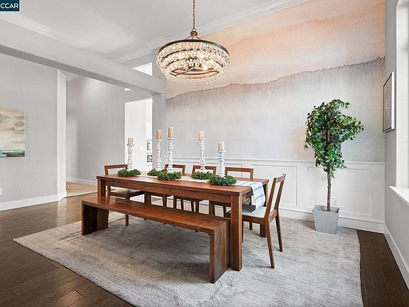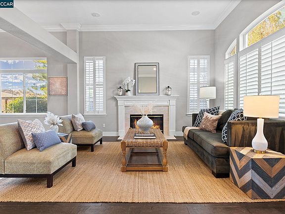 Desirable 4 bedroom, 1 story Crystyl Ranch w/ views. Step into the inviting living room complete w/ fireplace & hardwood floors that flow seamlessly to the formal dining room. An office off the entry provides the ideal work-from-home lifestyle. The refreshed kitchen boasts dual ovens, a gas cooktop, dishwasher, breakfast nook & center island w/ bar seating & deep sink. With sleek cabinetry & stylish backsplash, this kitchen is both functional & stunning. Adjacent is the airy family room w/ high ceilings, built-ins & a fireplace, creating a welcoming atmosphere. The expansive primary suite features a walk-in closet w/ built-ins & backyard access. The luxurious ensuite showcases a 2-way fireplace over the soaking tub, a stall shower w/ dual shower heads, a dual sink vanity & a water closet. 2 additional bedrooms share a full hall bath, offering dual sinks & a tub-shower combo. Extra highlights include a front porch for relaxation, a convenient 3-car garage & a laundry room w/ sink & cabinetry. Your picturesque backyard awaits w/ a patio for entertaining, a lush lawn & terraced garden displaying rolling hill views & backing to open space. HOA amenities include tennis courts, clubhouse, pool, playground & more. Close to downtown, Lime Ridge, Mt Diablo, Concord Pavilion & top schools