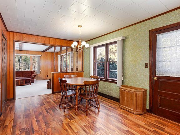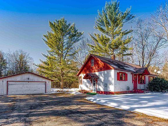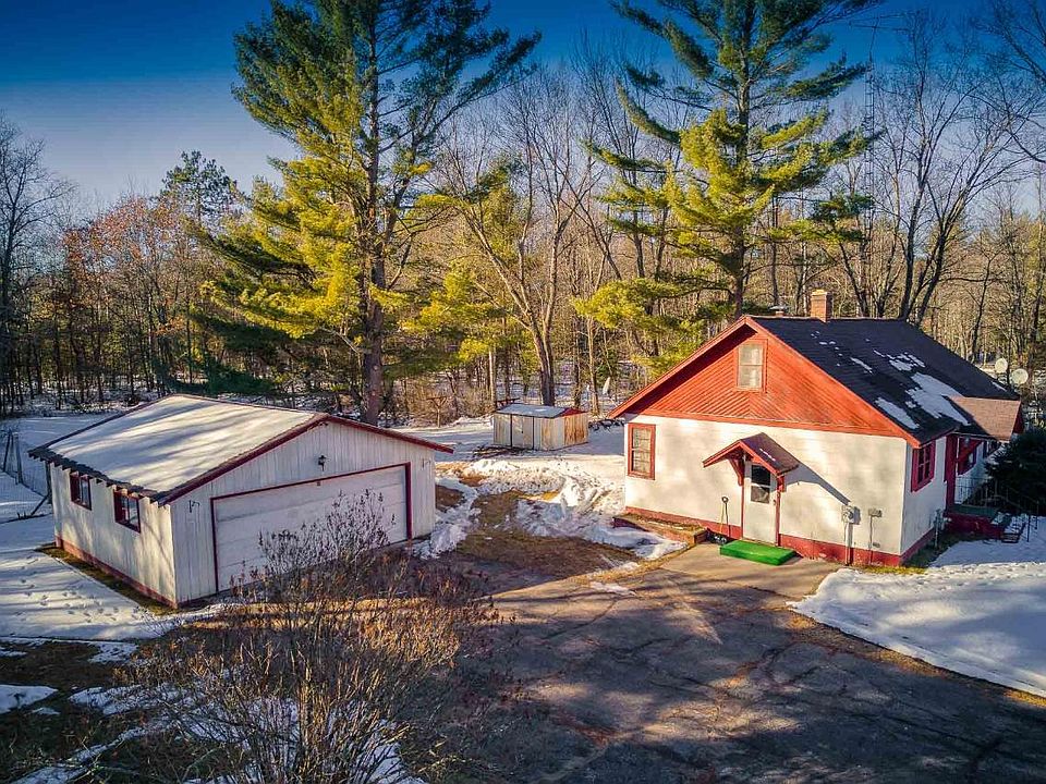 Adjacent to Three Eagle snowmobile, bike, hike, cross country ski trail on the west and the ATV trail on Loon Lake Rd, one and-a-half story, 1950's home, 3 bedrooms, 1 bath, 1.139 acres, 2-car detached garage (24'x26, 7' overhead door, automatic opener), paved driveway, town road, 1 mile south of town. Main Level: 2 bedrooms, 1 bath (low threshold shower), clothes chute, wood burning fireplace (exterior ash cleanout), 3 entrances (one in each kitchen, dining, and living room). Upstairs: open area at top of stairs, heated bedroom (no closet), and a floored cold-storage attic. Large Partial Basement: poured foundation (crawl space under living room, a 1964 addition), natural gas forced-air furnace (2017), natural gas water heater, point-well, hookups for washer and dryer (gas), small workbench, exhaust fan, water softener (4-5 yrs old), sump pump. Level & open yard, fenced-in garden area, lilacs, rock garden, 9'7"x12' shed, woods at the back of the lot. So convenient. Great potential.