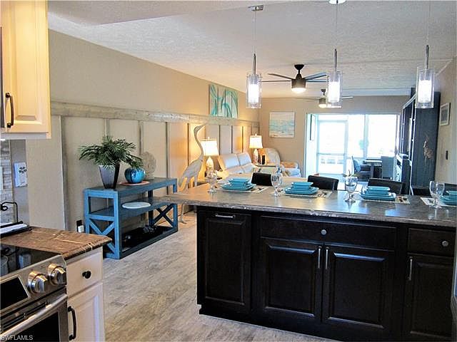 1st FLOOR; CORNER UNIT; GULF ACCESS; NEW METAL ROOF; NEWLY REPLUMBED BUILDING; SUPERBLY RENOVATED Condo w/EXPANSIVE LANAI (192 sq ft) w/Waterfront Views. ELEC HURRICANE SHUTTERS provide addl safety. Welcome to the Financially Sound & Impeccably Maintained Community of CAMELOT CONDOS. With a 10-12 min. boat ride to the River, dock your boat out back (1st come; 1st Served). Swim-n-Sun in the heated pool area under blue skies & tropical breezes. Centrally located in the HEART of Downtown Cape Coral. Walk, Bike or Ride to all the Cape's fabulous amenities! STOP & LOOK AT THE PICTURES! No Expense was spared in the quality of materials or workmanship used in this COMPLETELY RENOVATED PROPERTY. (See Before & After Photos during your Private Showing) New Porcelain WoodPlank Flooring & Bedroom Carpeting, Exquisite Top Grade Granite Countertops, Modern Glass Backsplashes, SS Appliances, Kitchen Island w/ Clever Storage Features, Very High End Lighting & Fan Fixtures, Spa-Like Baths w/ Vessel Sinks, Glass Block, Tile Appointments & High Efficiency Toilets, Remote-Controlled Master BR Window Coverings, Extra Int/Ext Storage areas. (See attached for complete list of renovations )