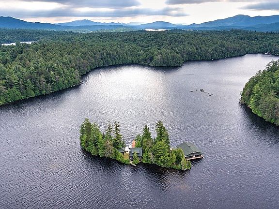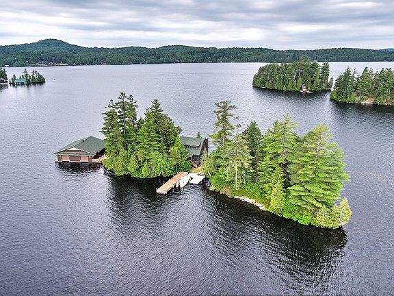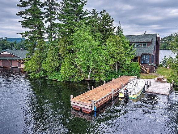 Spruce Island, situated in the South Basin of Upper Saranac, presents a great opportunity to experience the lake in a unique way. The main cabin has a full, modern kitchen, dining area and cozy living room as well as a master bedroom, from which you can enjoy the sunrise and sunset. Two cute bunkhouses offer additional sleeping quarters. The oversized boathouse can accommodate any fleet out there. Connecting walkways, an area for a firepit, serene hammock site, wild blueberry patch and dense softwood vegetation add to the charm of this fun island.