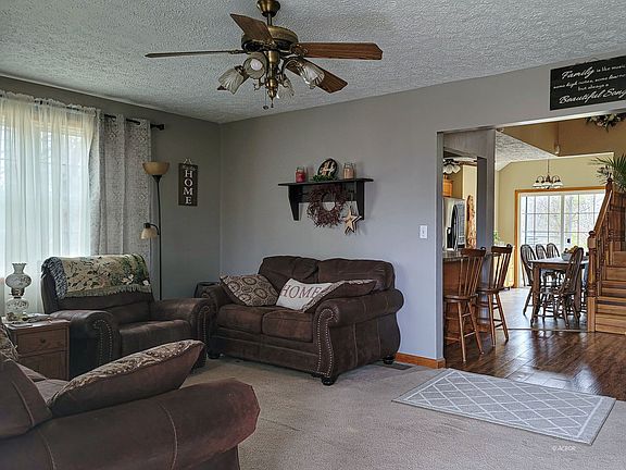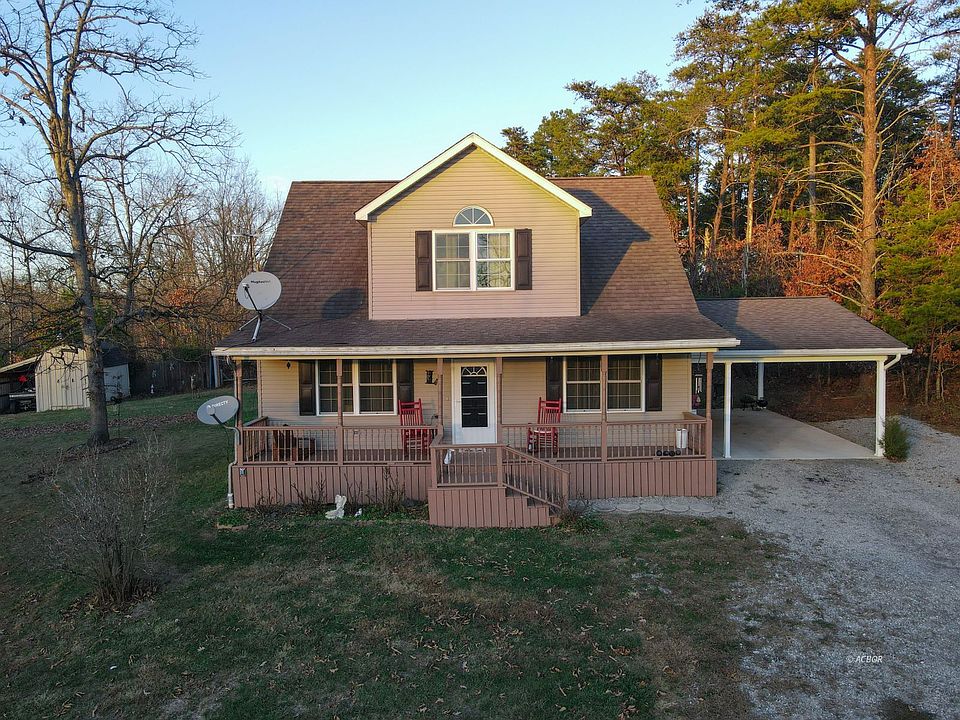 Sweet Cape Cod. This Cape Cod offers 2 potentially 3 Bedrooms and 2 full baths. The covered front porch is a porch sitters' dream. The living room features a gas fireplace and flows beautifully into an open concept, eat in kitchen complete with stainless steel appliances and a gas range. This home has so much character throughout. There is a large bedroom on the main floor and a complete full bath with walk in shower. There is a potential second bedroom on the main floor that could also be a beautiful office space. The half level upstairs features a large bedroom and bathroom with a soaker tub. It is nestled on just under 3 acres and has a large pole barn building/2 car garage space. Wifi is available.