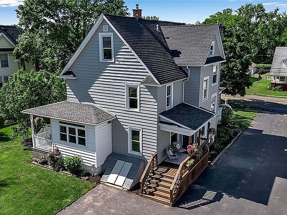Do not hesitate! Beautiful village home ready for your inspection. Remodeled and updated by RJZ Properties, LLC. 3 amazing porches to enjoy. Quality kitchen with custom tile work and Quartz countertops. Hugh butlers pantry. Stainless steel appliances included. 36 in Bertazzoni dual range. Functional coffee bar. Spacious dining room highlighted with pillars and curved box bay window along with additional seat storage. Oak pocket doors. Wonderful living room with wood burning fireplace. 1st floor laundry room. 1st floor custom full bath. Open stairway with custom railing. Vintage stain glass window in stairway. 2nd floor has a huge primary bedroom with walk-in closet. 2 additional bedrooms, huge common area and lovely ceramic tile full bath featuring authentic claw foot tub and custom shower. Unbelievable, fully finished 3rd floor with several rooms and separate furnace and A/C. New siding on garage along with overhead door and opener. Waterproofed basement. On demand HWT. This entire home renovated-2016. 28 foot round pool with huge deck.