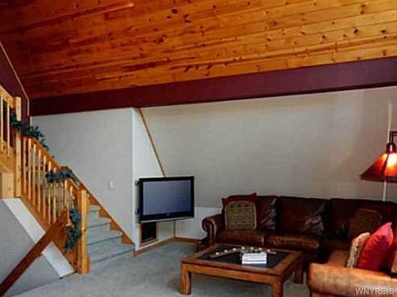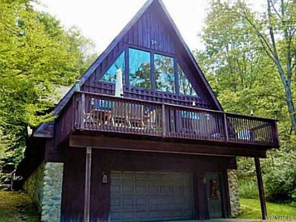 Original Owner's A-Frame on 5 acre wooded lot."Decorator Delight!" Fully applianced kitchen with dishwasher, range, refrigerator and wine cooler. Ceramic tile floors in foyer and baths. Hardwood floor in kitchen. Master bedroom on 3rd floor with bath, deck, sitting area overlooking the living room and the outside hills of Ellicottville. A total of 3 decks, a hot tub and a fire pit make outdoor living "at it's finest." This is a very private location with a long driveway but only 10 minutes to skiing at Holiday Valley. $12,000 in Pella windows & doors newly installed.