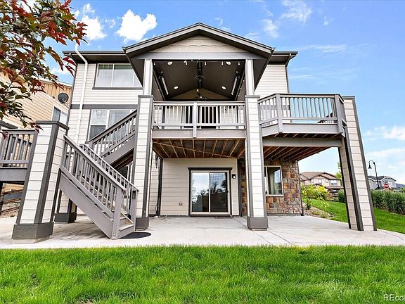 Leyden Rock Beauty! This home sits on a perfectly landscaped corner lot with lovely curb appeal and covered front porch! The interior offers an open floor plan with beautiful hardwood floors, gourmet kitchen with granite countertops and granite kitchen island and stainless steel appliances. The kitchen opens up to the family room with high ceilings and an amazing stone brick fireplace that goes all the way up to the ceiling. Formal dining area just of the kitchen for those holiday gatherings and a seperate office at the front of the house so you will be undisturbed white the party is going on in the kitchen and living room. Upstairs is a comfortable loft that can be used as a play area for the kids or a reading library. A large primary bedroom with a 5 piece bath (double vanity, glass shower, large tub) and nice size his and hers walk-in closets. Two other bedrooms and Jack & Jill full bath round out the upstairs. The finished basement offers a nice size living area with wet bar for game day and has the teenager basement bedroom and 3/4 bath. There is also storage area in the basement. The fun part about this home is the amazing deck just off the kitchen and living room. This deck has plenty of room for family and friends for barbecuing and enjoying the sunsets from this wonderful subdivision. This deck has outdoor lighting and electric heat elements so can still enjoy it even if it's a little cool outside. Don't forget about the community pool as those summer days are upon us and enjoy a refreshing dip in the this amazing pool. The 3 car tandem garage has plenty of room for the hot rod as well as the family cars. Don't miss out on this great opportunity to enjoy this home in a very picturesque setting in Leyden Rock.