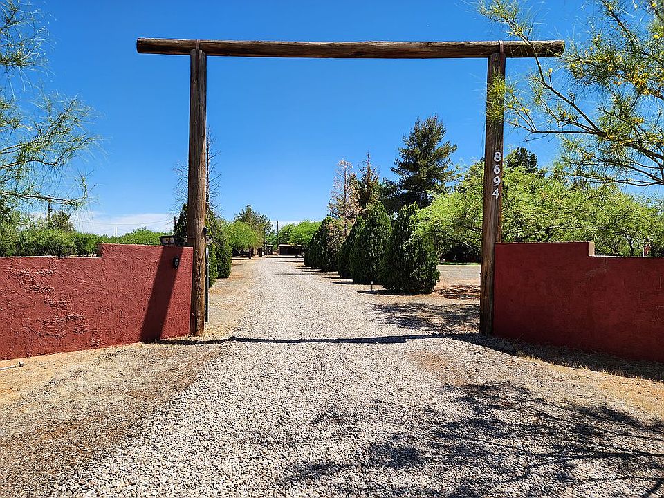 Beautiful 2277sqft three bedroom, two bathroom custom designed home with large open space throughout main areas that’s perfect for entertaining. Starts with a gorgeous gravel entry as you enter the fully fenced/gated 4.5acre lot with large turn-around area and covered parking for three vehicles. Walk up the partial wrap-around porch and into the large living area complete with pellet stove for those cooler nights that has stunning hand-picked stone wall from the nearby Kartchner Caverns. Going into the dining area has a built-in fireplace separating the spacious kitchen area with hand-made custom countertops made to admire the rare Lapis Lazuli stone looking through the kitchen windows overlooks a fully screened porch area perfect for admiring the large established trees, lush garden areas or head over into the attached den area with room for a pool table and connecting with family. Large master suite with walk-in closet and open office space overlooking backyard area with separate entrance outside. Backyard area includes Dual bathhouse building connected to private septic system, outside cooking center with ample counter space, room for a stove and barbeque. Large shop/studio building divided into two areas with high ceilings. Enclosed storage room with covered workshop area overlooking sectioned off orchard filled with various fruit and other trees. The other side the yard has an outlined rock walking path enjoying the natural desert landscape taking you back to a quiet patio area with outdoor fully encaged garden. Further behind has an additional space for you to add your own touch at this wonderful escape to paradise out in the southern Arizona.