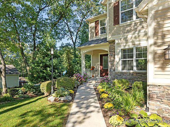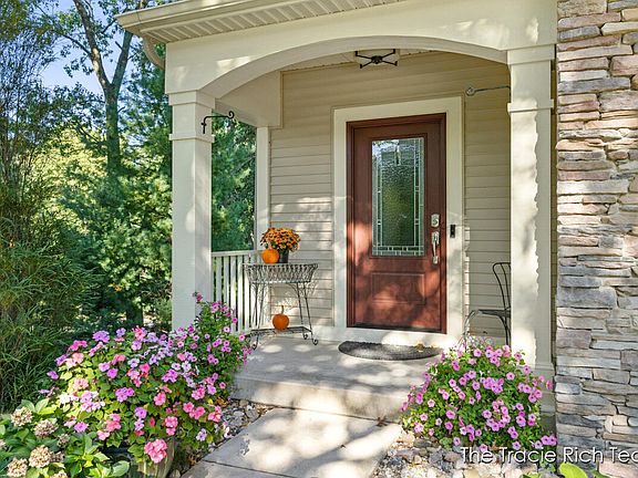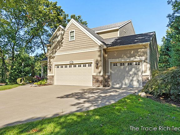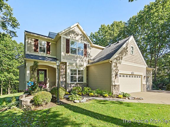 This immaculate home offers both luxury and privacy, situated on a beautifully wooded lot with association green space behind, giving the yard an expansive feel. Conveniently located just 5 minutes from downtown Rockford, as well as nearby bike trails and parks, this home blends nature with modern living. The interior is a showcase of high-end craftsmanship, featuring hand-scraped flooring, crown molding, and wainscoted walls. Custom finishes throughout add to its charm, including a sunroom with glass French doors that could serve as a perfect kids' play area or tranquil retreat. The kitchen is a chef's dream, boasting high-end appliances, a stainless farm sink, ''Blue Flower'' granite countertops, and a walk-in pantry. Upstairs, you'll find 4 spacious bedrooms, including a primary suite. with luxurious features like a dual-head shower, dual vanity, heated floors, and custom walk in closets. The upstairs laundry adds convenience. The finished 3-stall garage is equally impressive, equipped with hot and cold softened water, a sink, attic storage and even a generator hookup. Outside, there's additional storage under the deck, offering practicality and efficiency at every turn.