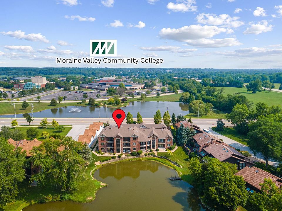 Beautifully Updated 2 Bed, 2 Bath Condo with Water Views & Garage! Welcome to this move-in-ready 2nd floor condo in a solid flexicore building, ideally located just across from Moraine Valley College and the Palos Hills Recreation Center with forest preserves just moments away! Situated in the sought-after Palos Park school district, this home offers a rare blend of nature, convenience, and modern updates. Step inside to find an open-concept layout with engineered hardwood flooring in the living room and hallway, timeless kitchen cabinetry, granite countertops, and a spacious sit-down island perfect for entertaining. The kitchen is finished with sleek Bosch stainless steel appliances and plenty of storage. Enjoy serene water views from your private balcony, complete with a newer balcony floor. The spacious primary suite features a double closet and private bath with a walk-in shower. Both bedrooms are generously sized and include upgraded day/night blinds. Additional highlights include a side-by-side laundry room with newer washer and dryer, newer HVAC, stylish brick hallway accents, one garage space, an additional assigned parking spot, and guest parking. Investor-friendly HOA, unbeatable views, and a location that checks every box don't miss this one!