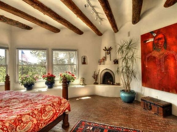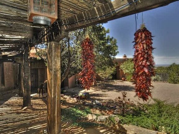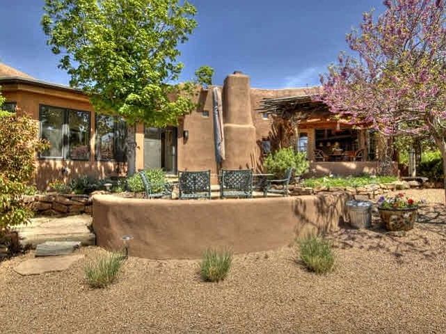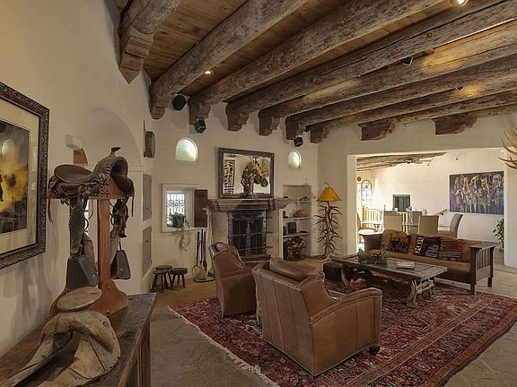 Custom built pueblo style home in Arroyo Hondo. Large indoor and outdoor living spaces. 3 large bedroom suites, gallery hallways, 4 fireplaces, a studio, 3 garage spaces, horse barns, and gardens.