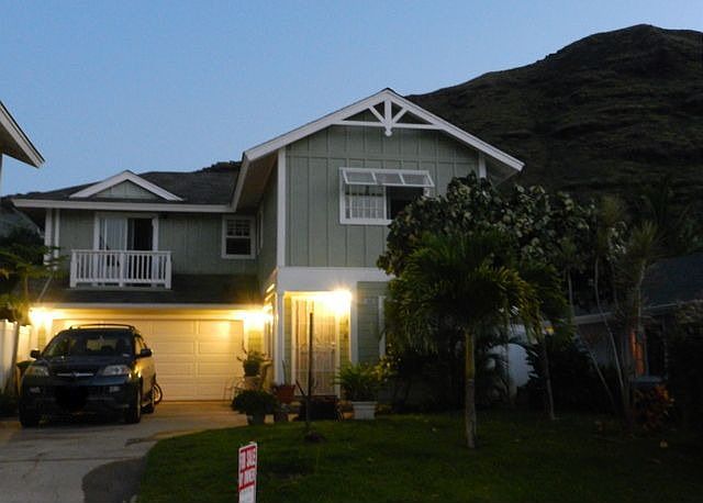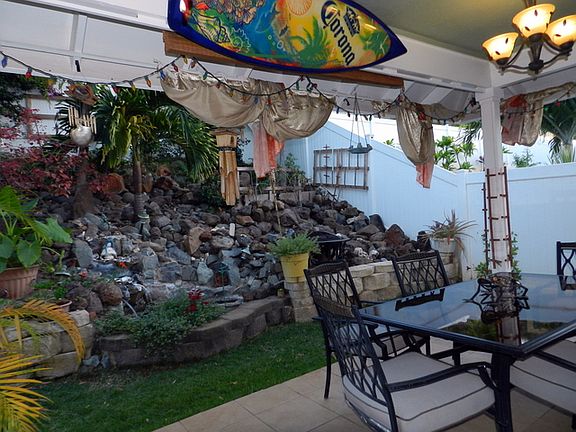 Beautiful and comfortable, remodeled throughout in 2009-2012. Two very efficient Fujitsu split-system A/C for downstairs kitchen/LR, and for master bedroom. Open breakfast bar & pantry area, custom marble countertops, custom tile bathroom floors and counters with upgraded sinks & faucets; upgraded Maytag over-stove microwave unit and Gemini range (double-ovens). Grass front and back, rockgarden with mature tropical plants, fruit, garden area, micro-pond and waterfall feature. All 3 bedrooms separated by bathroom and bonus den room with its own extra built-in closet. Laminate floors throughout LR, kitchen and upstairs den, tile floors in bathrooms, carpeted bedrooms. Automatic Irrigation system front. Solar hot water. Sea Country pool and clubhouse for residents; Sea Country store and Keiki Country daycare are literally around the corner.