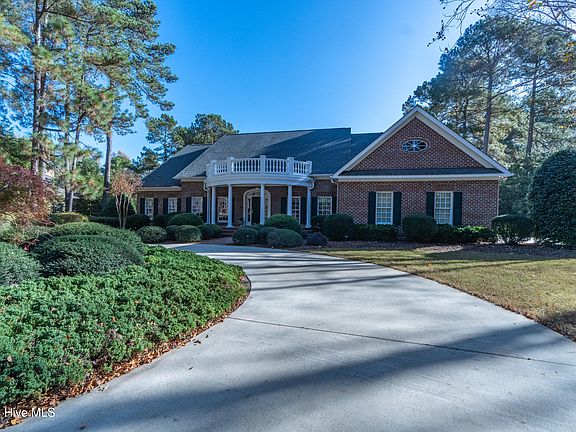 Amazing all-brick, golf front home by Bonville Builders on the Holly course at the highly desired Pinewild Country Club in Pinehurst, NC. Well-built and well-maintained traditional stately home with new roof in 2024 and many updates. Popular open concept plan with panoramic golf and pond views of the 11th, 12th & 13th fairways, and greens from all main living areas. An abundance of natural light and formal and informal living areas. Hurd windows and doors, crown moldings, wainscoting in dining room, trayed master suite, 8.9-ft ceilings on lower-level daylight (walk-out) basement, partially finished storage, oversized 3-car garage, and home office. Cook's kitchen has 5-burner gas cooktop, island, prep sink, bar, walk-in pantry, convection oven, and spectacular views. Living room features oak floors, built-ins, and gas log fireplace open to 'Trex' type deck. The luxurious master suite has his and her walk-in custom closets, a cedar lined closet, double vanities, soaking tub, tiled walk-in shower, oak floors, plantation shutters, and gorgeous golf views. Enjoy additional storage both in and over garage, a workshop, central vacuum, irrigation system (not warranted), home warranty, termite warranty and more. Irrigation system served by a well. Sound system operates door bell.
