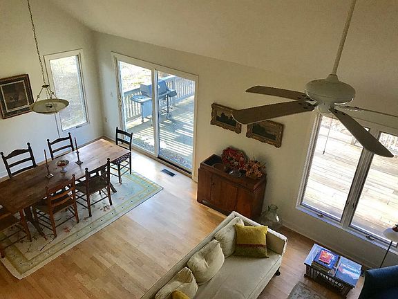 This light-filled, private end unit, is set toward the back of the complex. The high ceilings, wall of windows and wood floors make the combination, living dining room so bright. A wood burning fireplace at the living room end adds to the ambiance. There are brand new stainless appliances in the kitchen, with its cheery breakfast nook. A large first floor master bedroom offers vaulted ceilings, access to the deck, a walk-in closet and en-suite master bath. There is another bedroom or den, full bath and laundry on the first floor. The second floor offers a spacious bedroom with full bath and walk-in closet. Outside the large, private deck looks over green space. Lions Head is a beautiful complex, well laid out with privacy in mind. There is an in-ground pool and tennis court and it is walking distance to the village of Salisbury.