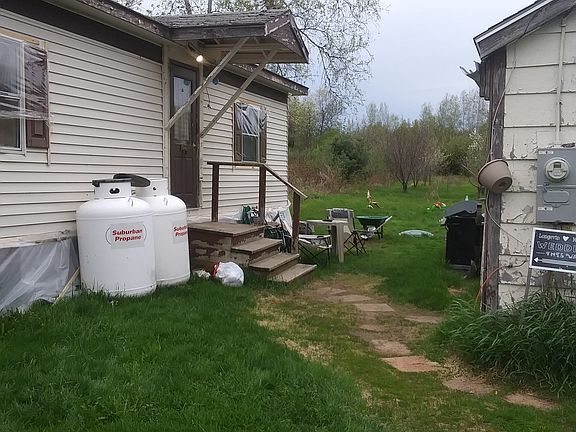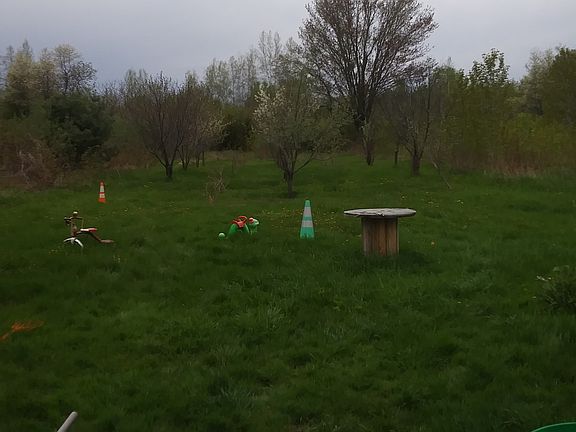 2 bedroom 1.5 bathroom trailer on about .44 acre of land with a large 1 bay garage and a small orchard in the back with apples, plums, peaches, cherries, grapes and bluebirries. The back yard has a nice natural fence during summer to which has been great for letting the little ones run around! The trailer needs work but is livable (we currently live here). NO RENT TO OWN OR OWNER FINAINCING!