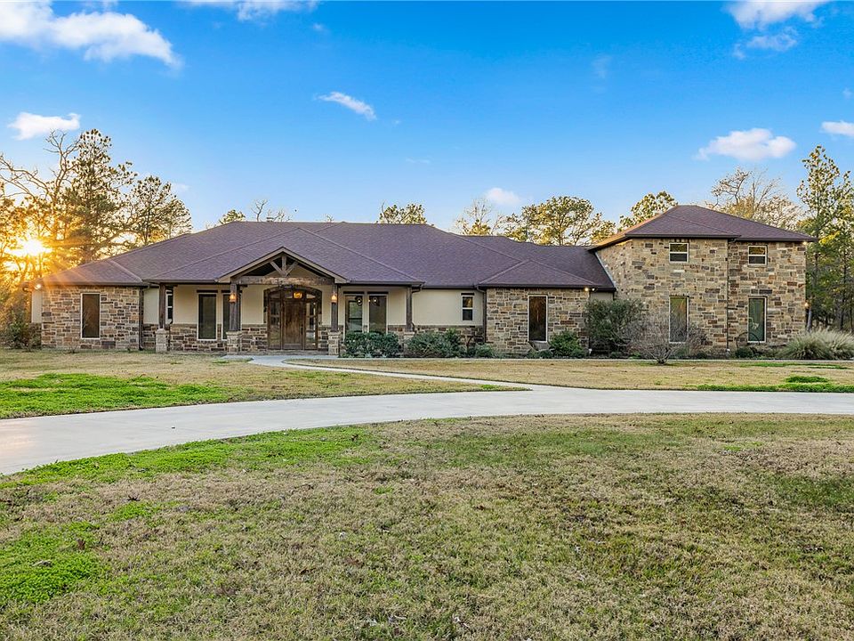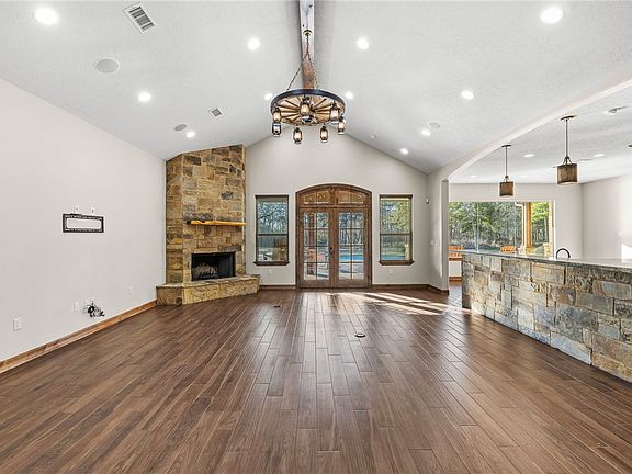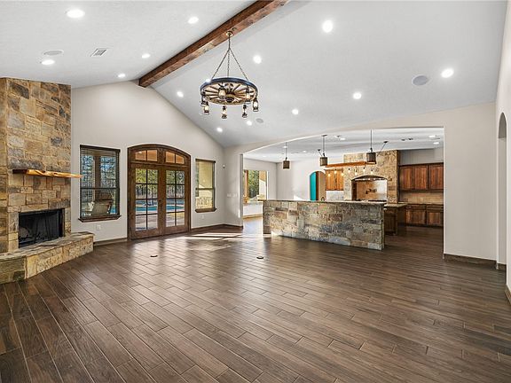 This property seamlessly blends modern elegance with the serenity of rural living. Nestled on nearly NINE acres, this custom-built home offers the ultimate retreat. Step inside and be welcomed by spacious, open-concept living designed for both comfort and entertaining. With 5 bedrooms and 4 bathrooms (including 3 en-suites), an office, formal dining room, and thoughtfully designed laundry room, every detail has been carefully considered. At the heart of the home is a chef's dream kitchen, featuring real wood cabinets, leathered granite countertops across two islands, THOR appliances, and a perfectly appointed pantry. The expansive primary bedroom and en-suite offer a luxurious escape, complete with a stunning copper soaking tub and walk-through shower. Upstairs, a game room above the garage adds a touch of fun and functionality, while the backyard transforms into your personal oasis. Enjoy the extensive porch, pool, hot tub, and gas fire pit, ideal for relaxing or entertaining.