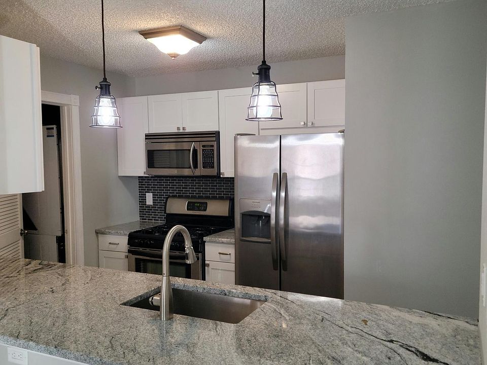 Recently renovated lower level 1 bedroom condo with washer & dryer. Open kitchen with stainless steel appliances that open to the living room with French doors leading to the patio. Full bath and large bedroom w/ 2 closets. Great location for the commuter. Good credit. Small dog (under 25 lbs) considered, No cats, Room sizes are approximate.