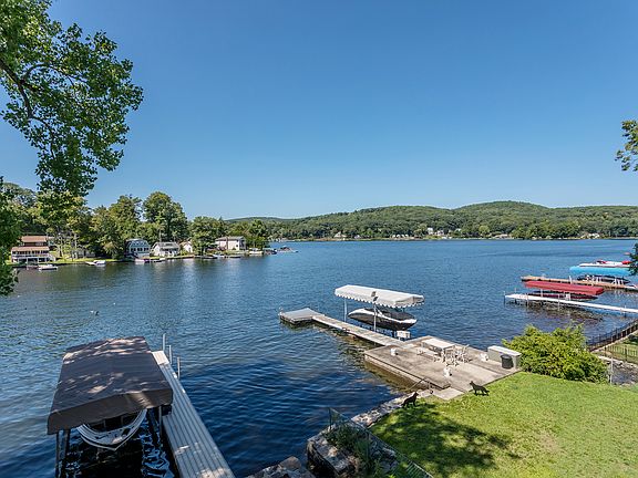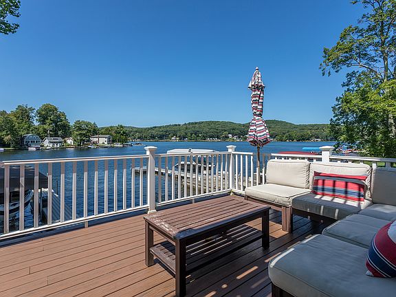 Beautiful year round home on Highland Lake. You will not find many stylish renovated lake houses that give the WOW factor as soon as you open the door. Brazilian cherry floors throughout the first floor and a well equipped kitchen with soft washed look cabinetry, granite tile counters and excellent storage space. The open living room and dining room brings the waterfront, views and sunlight through. Sliders to a 26 foot deck is a great extension for enjoyment from the living room. A full bath and laundry complete this level. The second floor master has its own lake view balcony and ample closets and the tiled bath with shower is handsome with its tiled floor and skylight. There are two additional bedrooms with Brazilian cherry floors. The lower level has a family room with stone tile floor, track and recessed lighting. A stone patio at this level meets a nice lawn with walk in access to the water. The aluminum dock and hydraulic boat lift are included and dock supports replaced 2017. Sold mostly furnished except for M. bedroom furniture and a few pieces. Security monitor system & cameras, central air, oil heat. Storage area in lower level. Highland Lake is a 444 acre boating lake with kayaking, paddle boarding, sailing and a trophy fishing lake. 30 min. to Bradley International Airport, 20 minutes to Litchfield, 2 hrs. to NY & Boston. Fine restaurants, music venues, great shops and ski areas near by. A beautiful lake to enjoy all four seasons. Town water and sewer.