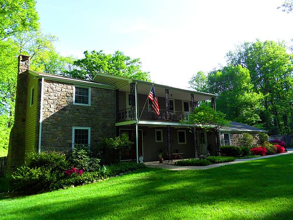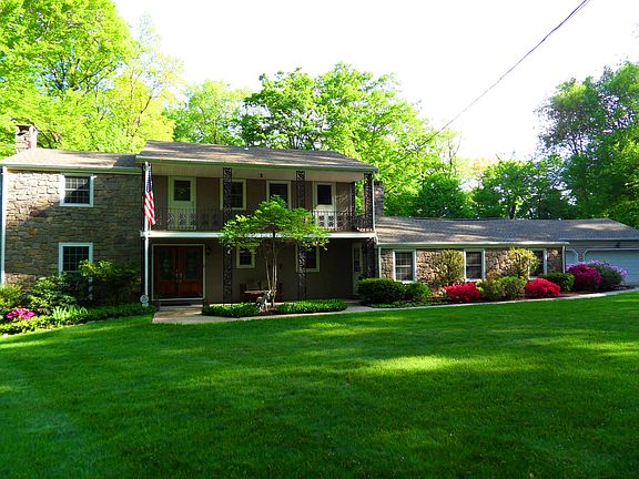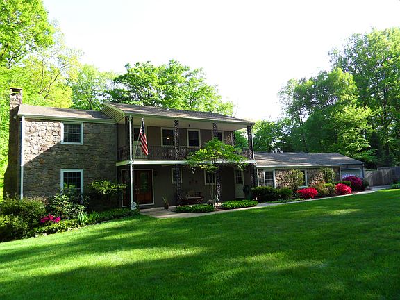 Situated on a private lot close to the heart of Doylestown, this extraordinary move in ready stone/siding home offers a flexible layout filled with natural light and unique architectural interest. A covered front porch is large enough to spend an afternoon with a good book, and double mahogany entry doors lead inside where rich oak floors start at the foyer and continue upstairs and throughout most of the main living area. The formal living room is complete with a wood fireplace with raised tile hearth and wood mantel. Transom windows allow a panoramic view of the private fenced in back yard from the formal dining room. Entertaining is a breeze with access to both the kitchen and family room, where a wood and stone fireplace adds warmth and charm on winter nights. The recently updated kitchen features 42" cherry cabinets, stainless steel appliances, gorgeous granite counter tops, a tile backsplash, and center island. A full butlers pantry/laundry area is tucked along the side of the kitchen and has additional cabinets, pantry, sink and counter/work space. A great room addition with vaulted ceiling, wood stove, built-in shelving, new carpeting and paint and outside access to the covered breezeway leading to the three car garage would be a wonderful space for entertaining or visiting in-laws! Upstairs the main bedroom is generously sized and offers a full updated bathroom, a large walk-in closet and outside access to the unique second floor balcony with decorative wrought iron railing. Three additional large bedrooms share the hall bathroom and another second floor balcony access door. The partially finished walkout basement has a picture window, half bath with a roughed-in shower stall - perfect for accommodating pool guests! Vacation at home with a custom in-ground swimming pool, recently heated, with expanded patio, dining areas, lush lawn and privacy wall. The manicured landscape showcases extensive brick paver walls, mature trees, beautiful flowering gardens and bushes, along with multiple tiered decks with hot tub and lighting throughout. Newer roof, newer septic. Walk or bike to downtown Doylestown Borough and SEPTA train station. Enjoy all this in award winning Central Bucks School District.