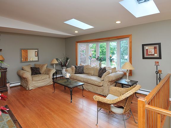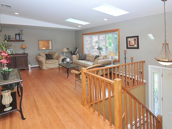 Expanded Raised Ranch with numerous upgrades throughout: beautiful EIK w/quartz counters & SS appliances newly refinished hw floors crown molding cathedral ceilings skylights recessed lighting new garage doors/motors/keypad new Biasi boiler & water heater. Lower-level w/marble fireplace is completely updated and provides a great entertaining space or guest area. Other special features include: master bath finished laundry room heated sunroom Trex decks and private yard with heated pool