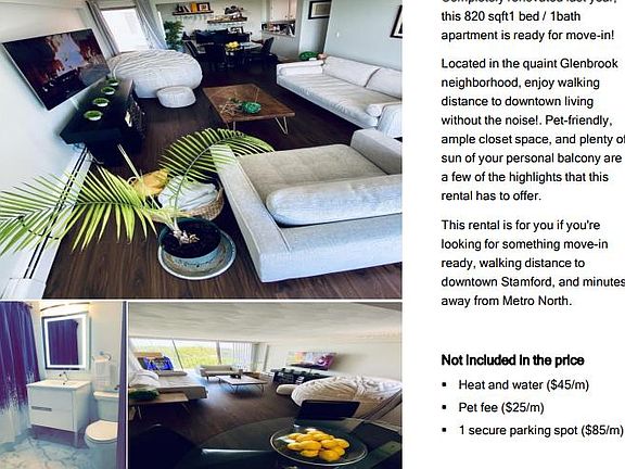 Completely renovated last year, this 820 sqft1 bed / 1bath apartment is ready for move-in! Located in the quaint Glenbrook neighborhood, enjoy walking distance to downtown living without the noise!. Pet-friendly, ample closet space, and plenty of sun of your personal balcony are a few of the highlights that this rental has to offer. This rental is for you if you're looking for something move-in ready, walking distance to downtown Stamford, and minutes away from Metro North. Not included in the price Heat and water ($45/m) Pet fee ($25/m) 1 secure parking spot ($85/m)