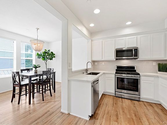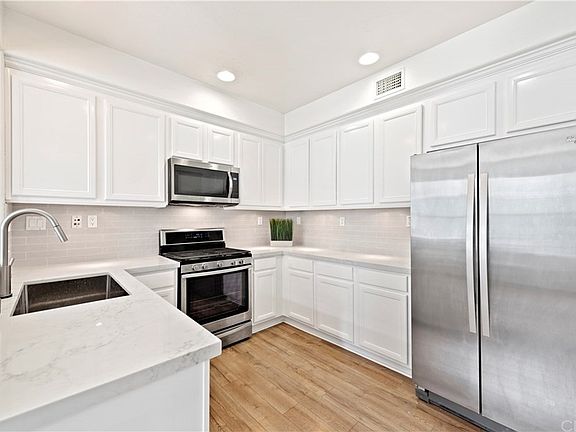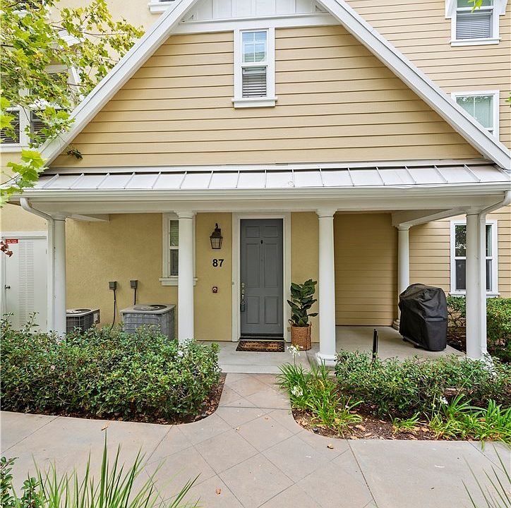 Welcome Home to this beautifully re-designed 2 bed/2.5 bath, 1259sqft corner townhome! Enter a private front door to a Vintage tiled entrance and walk upstairs to the main floor great room where you will be greeted by NEW and RENOVATED KITCHEN complete with Quartz countertops, designer back splash, a NEW stainless big basin sink and smart faucet! NEW designer lighting and contemporary laminate flooring along with a NEWLY tiled powder room also complete the 2nd floor great room. Enjoy an evening by the fireplace or beautiful neighborhood views from the generous sized balcony! On the 3rd level you will find dual ensuite master bedrooms and a conveniently located washer/dryer. This unit has a single car garage with a reserved parking space. This popular Valmont Community is conveniently located in award winning Terramor Village at the top of the infamous Ladera Ranch Paseo where all the fun is walkable. The paseo conveniently connects to the Ladera Ranch Water Park and Skate Park, toddler parks and Exploration Rock Wall park, the community garden, popular clubhouses and pools, Top Ten Rated Oso Grande Elementary School, a private preschool, and much more. HOA includes FREE high speed internet and 24 hour security!