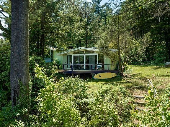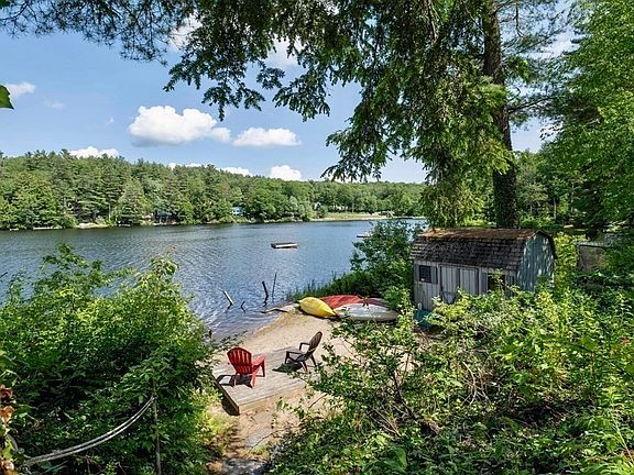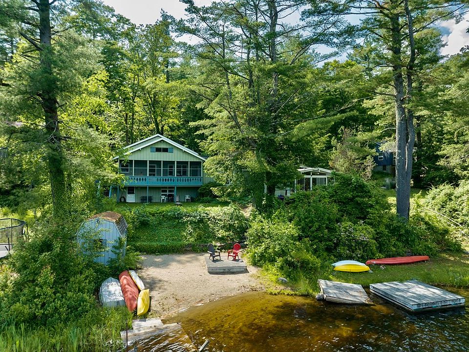 HIGHEST AND BEST BY SUN 6/25 8PM. Rare and special 4 BR, 2 BA seasonal vacation home on beautiful Hammond Pond in Goshen, with your own private beach on 152' feet of frontage! What was once 2 separate cottages is now connected by a walkway, ideal for extended family or friends to have their own separate living spaces, kitchen, bedrooms and bath. Or rent out one side for extra income while staying in the other. Each cottage has its own style and includes 2 bedrooms and a full bath. The mid century cottage has a striking open floor plan, vaulted ceiling, fireplace with slate surround, updated kitchen, bath and a lovely deck. The other, a charming wood paneled cottage with an expansive screened porch that overlooks the pond plus a full walk out basement. Swim, canoe, kayak and enjoy community events at Hammond Pond Association (hammondacres.org). Included in the sale:rowboat, canoe, dock and raft. Much of the furniture negotiable.Whip City Internet avail.