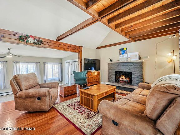 This charming, remodeled ranch home at 87 Lenape Trail in Albrightsville, PA, is perfectly situated on a corner lot, making it an ideal find for families, couples, or investors in an STR-friendly community!! It features beautiful hardwood floors and tile throughout, complemented by an updated kitchen with granite countertops and a cozy gas ventless fireplace for those chilly evenings.