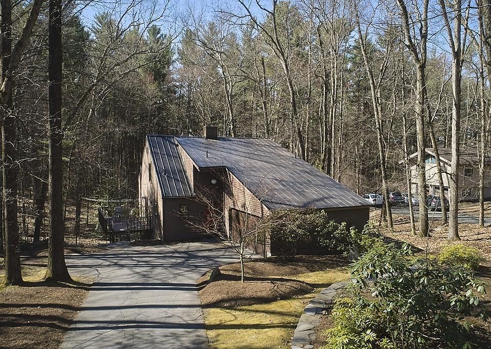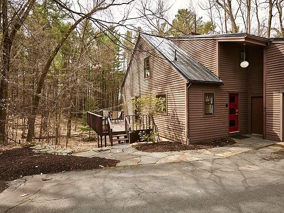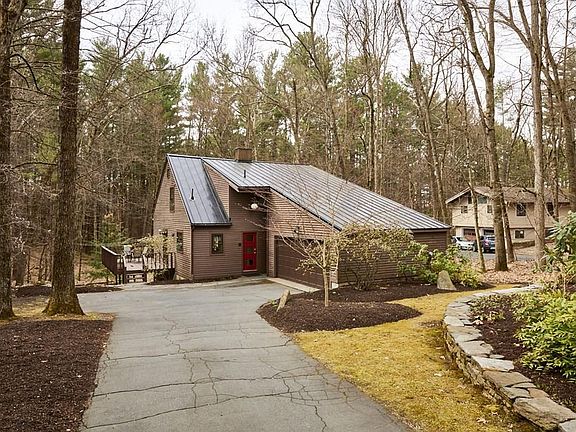 The details and design in this meticulously maintained home will captivate you! The first level open airy floor plan, a stunning window installation, beautiful hardwood floors and renovated kitchen and dining area combine for easy living and entertaining. Home designed for passive solar, newer windows (2017), newer heating system (2012), central air conditioner (2012) and hot water tank (2019) make this an energy efficient Contemporary. First floor bedroom and full bath . Loft area on the second floor currently used as an office. Spacious master bedroom, full bath and another bedroom complete the second floor. Walk out finished basement with floor to ceiling windows and slider overlook the private wooded rear yard. New metal roof ( 2015) and garage door. Beautiful Goshen stone walk way, stone wall and low maintenance plantings for a finishing touch! Minutes to Amherst town center, a short walk to Cushman.
