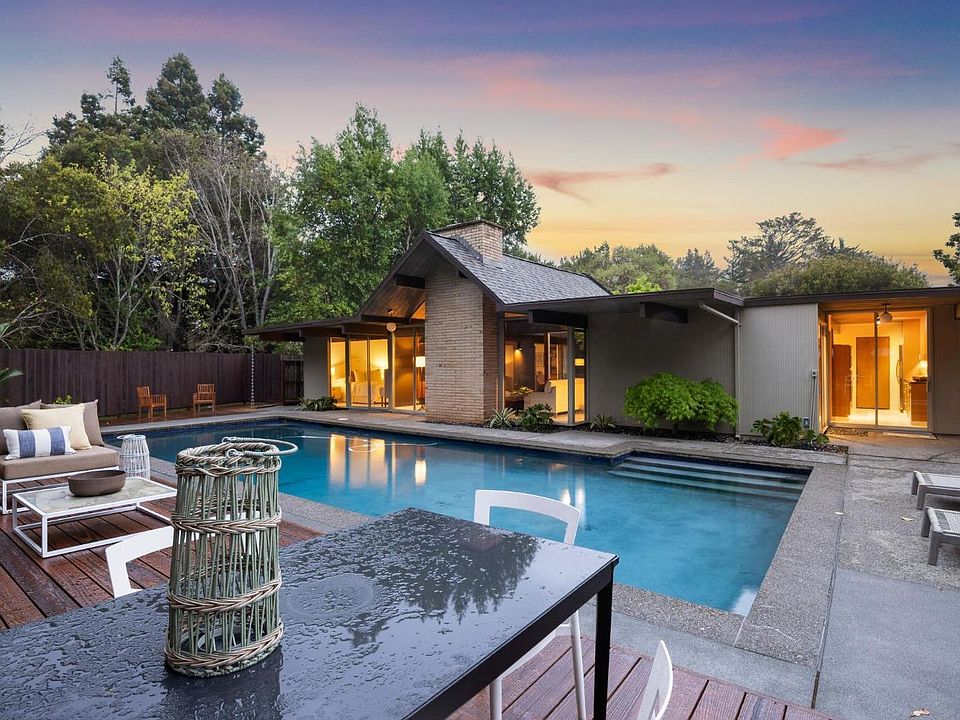 Sophisticated Balinese-style Eichler home seamlessly blends mid-century design with modern amenities. The stunning Double Gable atrium welcomes you with a majestic maple tree, setting the tone for this resort-like retreat. Preserved Eichler details include original globe lights, stained ceilings, exposed brick fireplace, refinished mahogany walls, and authentic VCT tile floors. The remodeled chef's kitchen boasts custom cabinetry, stone counters, Heath tile, and a walk-in pantry, flowing into an open-concept layout. The primary suite opens to the private backyard and features a luxurious remodeled bath and walk-in closet. Upgrades include updated radiant heat, tankless water heater, modern door hardware, newer roof, and designer lighting. The lush landscaping, crystalline pool, raised deck, and tranquil patio create a true oasis. Located in the desirable Lucas Valley HOA and Miller Creek School District.