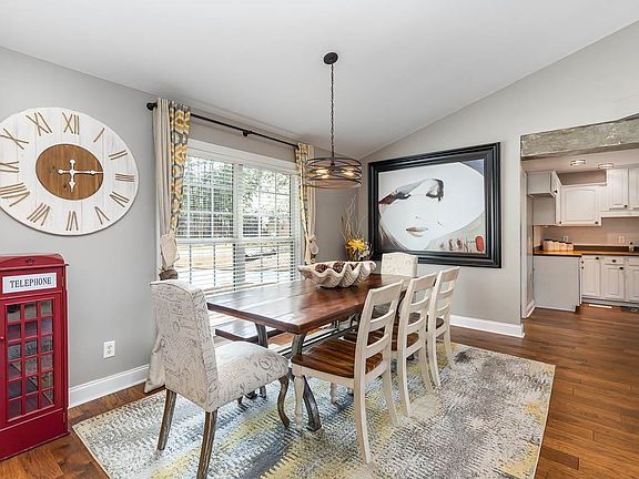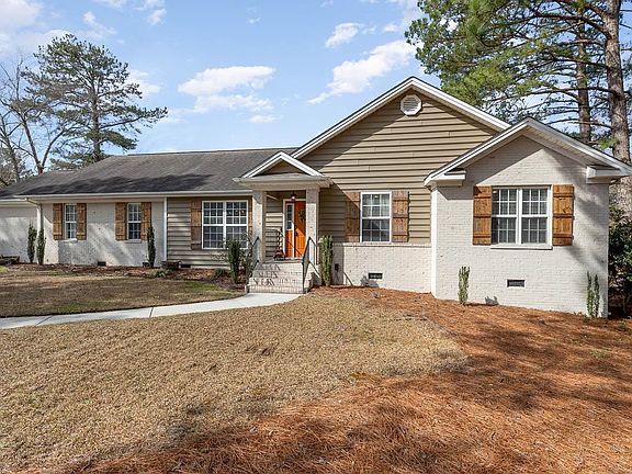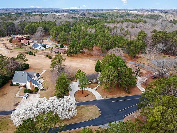 You'll leave the trials of the outside world behind as you enter into the Gated golf community of Carolina Trace & drive its forested streets to your new home. This enticing updated ranch w/a limewashed brick-front exterior has a circular drive & a side-load two car garage. It is on the 3rd tee of the golf course! It has views of the course from all rooms on the back of the house & oversized deck. Inside you'll find a very open floorplan w/a large high ceiling family room w/gas log fireplace, an attractive dining room & a spacious kitchen complimented by a huge 4.5' x 9.9' Dekton (high end scratch & heat resistant solid surface material) island & stainless steel appliances. A utility sink & pantry/cabinet highlight the laundry room w/direct access to the garage. The large primary bedroom w/trey ceiling has a tiled luxury bath w/a jetted garden tub, separate shower, raised dual vanities & a spacious walk-in-closet w/built-ins. Both secondary bedrooms are well sized. The 3rd bedroom is currently in use as an office w/glass French doors. There is no carpet in this home, just tiled floors & engineered hardwoods