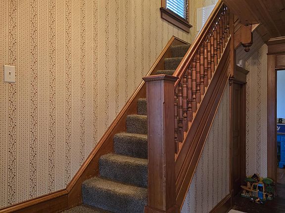 This 3BR/1.5BA Victorian style home with an inviting front porch is ready to be yours. It sits on a beautiful corner lot and comes with a 2 car detached garage, fenced in yard, & shed. Updates include: furnace & a/c in 2016, electrical updated in 2012, water heater with power vent in 6/22, roof 2015, & siding in 17. A radon system was added in 2018. The kitchen was remodeled in 2020 with sink, double oven, stove top, & dishwasher. There is a beautiful island in the kitchen that will stay. The main floor offer a main floor laundry with unique chalk closet doors. There are beautiful hardwood floors, molding,& interior doors thru-out the house. This home also offers an area in the basement that is currently being used as toy room but could be used for anything. 2 of the bedrooms upstairs are tandem bedrooms. All appliances can stay including the chest freezer in the chalk board closet. No appliances warranted. Dishwasher, washer, & dryer were bought in 2022. Enjoy your favorite summer beverage on the massive covered front porch.