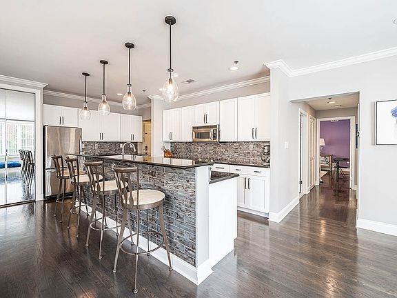 Stunning 2 bedroom plus office / 2 bathroom bright corner home with tons of natural light recently renovated with no expense spared! From the moment you walk into this open floor plan home, which is the only unit on its floor, you know you've discovered something special. The kitchen is well equipped and features an oversized center island with seating, granite countertops, glass tile backsplash, pendant and under cabinet LED lighting, an abundance of cabinet storage with custom built-ins and top-of-the-line stainless steel appliances. Living / dining room features hardwood floors, high ceilings, large windows, fireplace with Caesarstone mantle and spacious entryway closet complete with Elfa shelving. King-size master suite boasts a large walk-in closet customized with a California Closet system, a Juliet balcony, and a generous en-suite bathroom complete with dual vanity, Jacuzzi tub and linen closet. Second bedroom is spacious and bright with customized closets. Home office is equipped with a custom desk and large window. Guest bathroom has been meticulously designed and features a Hansgrohe shower system, frameless glass shower door, sleek floating vanity and Toto low-flow toilet. Additional highlights include: brand new LG washer/dryer, state-of-the-art centralized AV system, central A/C, Nest climate control, built-in speakers in living room and master suite, integrated smart home system compatible with Google Assistant, Alexa, Siri, etc. controls lighting, speakers and custom automated blinds, LED lighting throughout and 1 oversized car deeded garage parking space. Home can easily be converted to a 3 bedroom. Situated conveniently in Downtown Hoboken on 1st and Park, you'll find easy access to shopping, dining, the Hudson River waterfront promenade, Pier A and a 5 minute WALK to the Hoboken PATH into NYC!