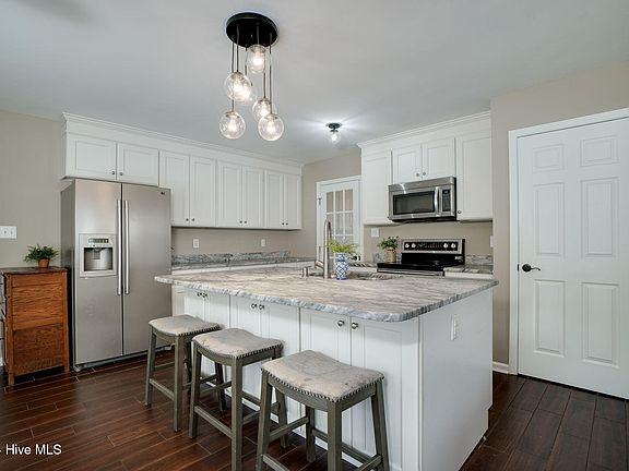 Beautiful home located in the desirable waterfront community of Pickett Bay, where properties rarely come on the market. Nestled just minutes from downtown Swansboro, this three-bedroom home, plus bonus room, offers comfortable living with modern updates. The first floor features durable LVT flooring and an updated kitchen, complete with marble countertops, stainless steel appliances, a spacious island for entertaining, and a dining area. This floor also has a laundry room, formal dining room, and a half bath. The cozy living room includes a gas log fireplace, perfect for relaxing evenings as well as a door that leads outside. The spacious deck overlooks the fenced backyard with plenty of privacy and a storage shed for tools or outdoor gear.