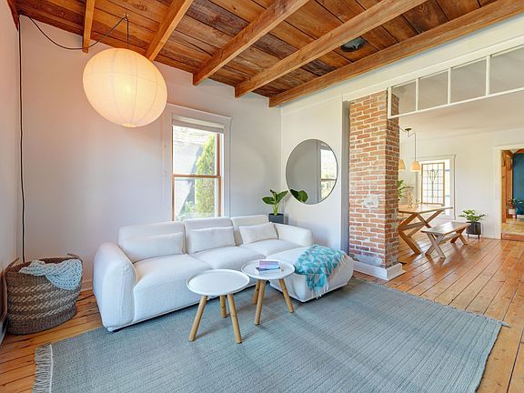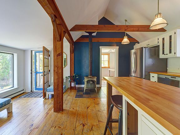 The cozy home features a bright and sunny open floor concept. First floor includes a unique post and beam kitchen with vaulted ceiling, new appliances and warm Vermont Casting wood stove. Sip coffee in the kitchen sitting area with full, sunny windows overlooking the private side garden. The attached tin roof porch is perfect for grilling or outside dinning. Wood floors throughout connect other first floor amenities including formal dinning room, an office/den with separate outside entrance, laundry room with built in cabinets and storage, and bathroom featuring Koehler fixtures.