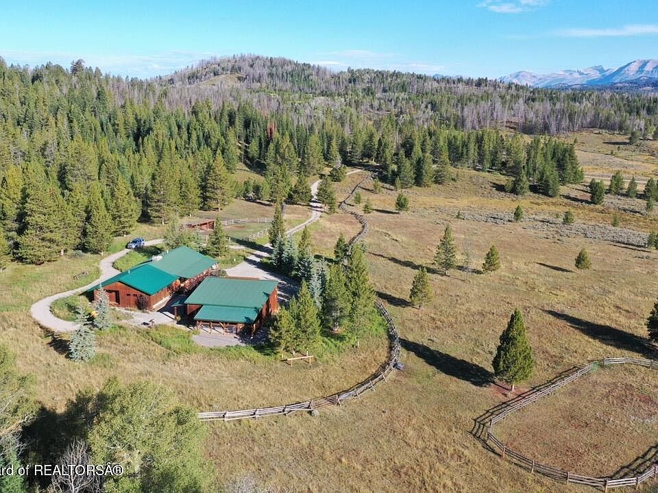 This picturesque mountain ranch sits on the edge of the forest with beautiful views of pasture lands in the foreground and the Wind River Mountains in the distance. This 49.73-acre property has a handsome log home, two-car detached garage and is fenced for horses. It is located on the edge of Bondurant, approximately 55 minutes from Jackson and 30 minutes from Pinedale. The outdoor recreation in this area is tremendous. The 2700 SF home has four bedrooms including a generous primary bedroom suite, built in 2014. The large detached two-car garage also has a bunkroom for overflow guests. Live water from a nearby spring flows year-round through the property making a convenient watering spot for livestock and wildlife. Winter access is over snow. Rim Road is not plowed in this area. The section of the main road which gives access to this property is not plowed in the winter. Winter access over snow.