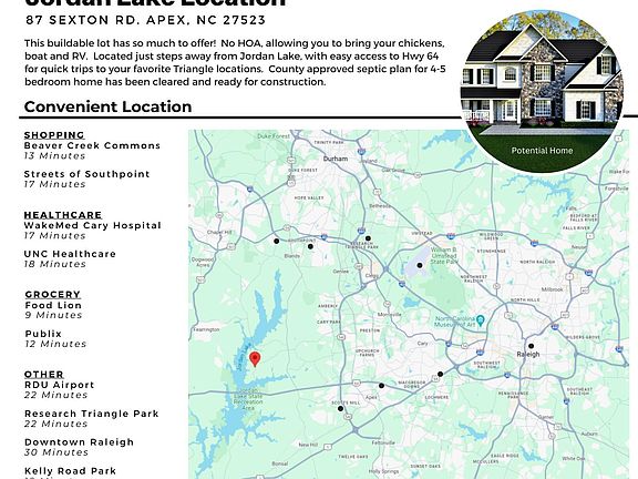 Bring your fishing poles, your chickens, or boat and RV! Build a custom 4-5 bedroom home on this beautiful stretch of land near Jordan Lake. Enjoy nearby fishing, hunting and outdoor activities with the flexibility that comes with having no HOA. Situated next to Army Corp of Engineers land, maintaining a wildlife feel for years to come. Best of all, a large portion of the lot has been cleared and a county septic plan has already been approved, saving you time and money on planning. Not only can you have your boat in the water within minutes of this property; this convenient location is close to Sweetwater, Beaver Creek Shopping Center, Streets of Southpoint and less than 25 minutes to RDU and RTP. Start your dream of building your custom home, with a lifestyle that offers rural living with the convenience of the suburbs. Just a short drive to Hwy 64 to access your favorite spots around the Triangle. This lot offers road access and electric, with an option to connect to water on Farrington. Bring your dreams and take a tour today. Please note - property line overlays are for illustration purposes and may not be exact.