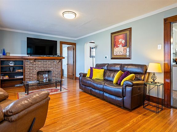 Step inside to find beautiful gumwood trim throughout the home, adding a touch of elegance and warmth. The living room features bay windows, a decorative brick fireplace, a wood mantle, and built-in bookshelves, creating the perfect space to relax or entertain. A cozy sunroom/office off the living room, with a separate door, opens up endless possibilities for your lifestyle needs.