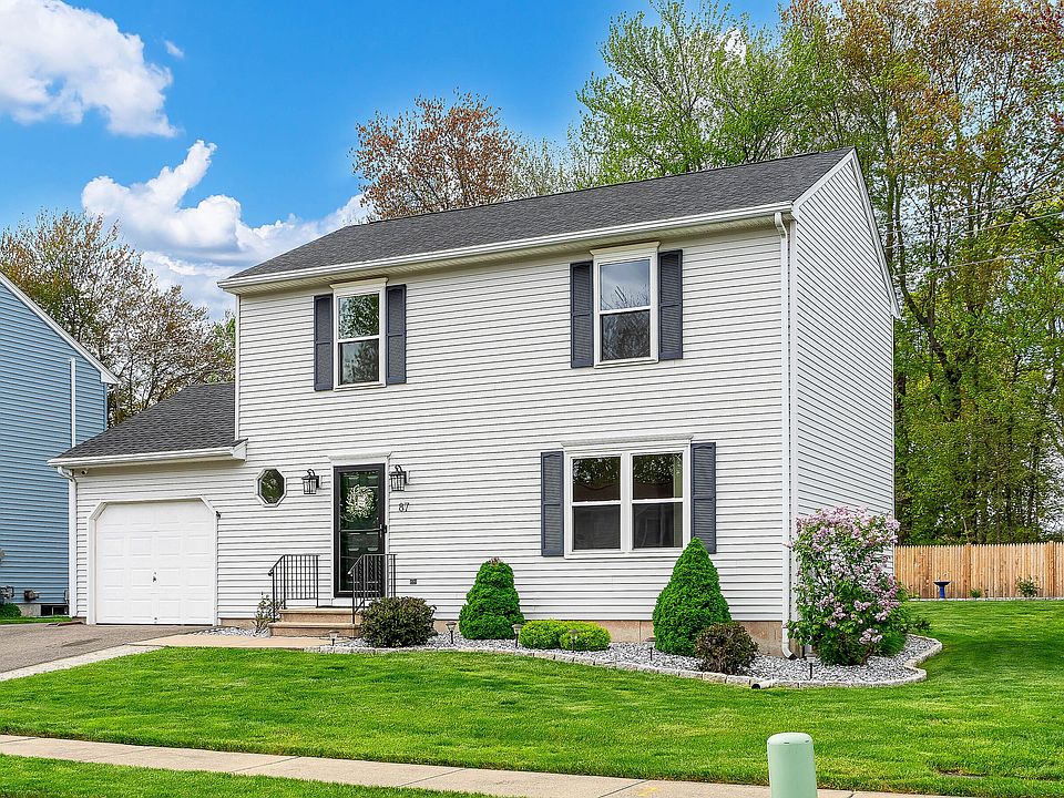 Interior just painted! Perfectly landscaped! This modern three-bedroom Colonial offers comfortable living in a desirable neighborhood. Stepping into the front living room, you're greeted by a spacious area with natural light pouring through two side by side windows seamlessly transitioning into the dining area, both rooms with gleaming red oak floors w/natural finish. The kitchen with a tile floor, gas oven range and a newer refrigerator has a convenient access to both the back deck (16'x12'), paver patio and the attached garage. A newly renovated powder room features a stylish vanity and tile flooring. Bright foyer with a octagon accent window. Upstairs, three cozy bedrooms await, with the primary bedroom having a walk-in closet. The full bathroom offers a combination tub/shower. The lower level, where you'll find additional finished space, makes a perfect recreation area and has a laundry closet plus plenty of storage space. Recent upgrades include a new CAIR Amana condensing unit and air handler (2 years new), a Timberline HDZ Lifetime roof, series 4000 double hung windows and a new gas water heater. The property is equipped with a 100 amp electrical panel with added Generator interlock. Outdoor amenities include a treated exterior deck and a spacious level yard with a a 6' high wood privacy fence. Snuggled between the Silas Deane Highway and the Berlin Turnpike; convenient to schools, shopping and restaurants. Comfort and convenience! Central vacuum system. Vent free natural gas compact fireplace with handmade solid oak framed mantle in dining room. Overhead garage door with LiftMaster opener. Trench with 4" pvc pipe to dry well completed in 2019. Dryer vent professionally cleaned by LintBGone September 2023. Generator ready. Such a well maintained home!