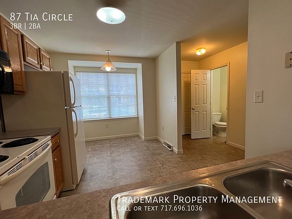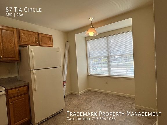 87 Tia Circle Mt Joy 3 Bed 1.5 Bath 3 Story Town Home - Go to www trademarklancaster com to apply and set up showings Donegal Crossings is a quiet town home community conveniently located between Mt Joy and Elizabethtown. It is only 5 minutes from Rt 283, 20 minutes to Hershey, Harrisburg, and Lancaster. The community offers a pool, a small gym, and lots of sidewalks to take an evening stroll. 87 Tia Circle is an end of row town home. It has a nice eat in kitchen a nice living room with access to the rear patio. The first floor also has a convenient half bath and a door to your large (unfinished) basement. Upstairs, the 2nd floor has a nice master bedroom with a large walk in closet and direct access to the full bath. There is also a nice sized 2nd bedroom and your full size washer/dryer. The 3rd floor is your 3rd bedroom. It is a loft layout with skylights, closets, and a nice closet. Contact today for more info! To apply and set up showings please go to Trademark Property Management's website. $50/adult to apply. Tenant pays gas, ellectric, sewer ($165/quarter), and a $45/month Resident Benefit Package (includes renters insurance, HVAC filters, pest control, 24 hour maintenance line. Pets negotiable. If approved there is a $400 deposit (refundable) and a $40/month fee (non refundable).