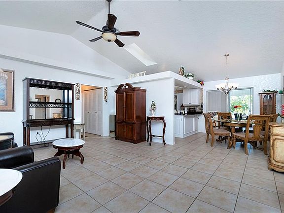 Feel welcomed home every time you arrive to this bright and airy home located in the much sought after deed restricted community of Deep Creek. This spacious 1,594 square foot home offers 3-bedrooms, 2-bathrooms, family room, 2-car garage and has been updated throughout. Beautifully landscaped yard providing great curb appeal, greets you as you approach your new home. Tiled floor entryway opens to the living/dining room area with high ceilings and sky lights to let in the natural light. The kitchen overlooks the family room and has been updated with stainless steel appliances, granite counter tops, an abundance of counter/cabinet space and planter shelving. The over-sized family room continues with high ceilings, tiled floor and pocket sliders out to the lanai. Your spacious master bedroom is carpeted with a large walk-in closet and a master bathroom that has been updated with granite counter top vanity, beautiful Roman shower and sky light. Family or guests will enjoy their own spacious carpeted bedrooms with large closets and fully updated guest bath. Head out and relax in your over-sized screened in lanai that has soaring ceiling with fan and overlooks your fenced in backyard that is great for the pets and kids on the run. Plenty of sunshine and space to add your swimming pool. There is an additional brick paver patio area that is partially covered and is great for your grilling activities. Home also features newer A/C in 2018, washer/dryer in house closet, attached 2-car garage with storage room, and hurricane shutters. This home is located minutes from golf, shopping, dining, entertainment, I-75 and US41. Deep Creek Golf course and park is minutes away. Seller prefers to sell home with furniture package for $15,000 separate from sale of house with some exclusions.