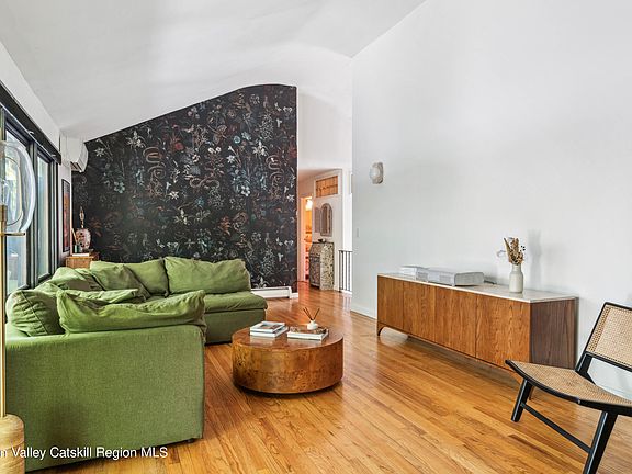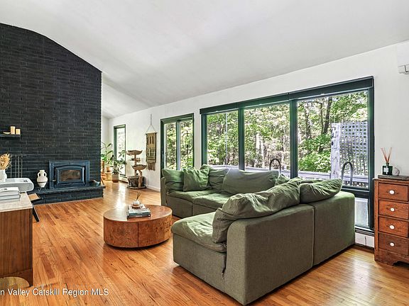 Stylish, well maintained Woodstock home. Set back from the road on a corner lot, framed by mature hardwoods and evergreens. This updated three bedroom, two and a half bath home features a double sided fireplace separating the living area from the dining area, a breakfast nook, and a wall of windows to let the sunshine in. Custom tile bathroom and walk-in shower adds to the charm and efficiency. Security system on perimeter of the house, electric car charger installed recently. There's plenty of room on the lower level which currently has an office and workout room. The laundry room is spacious, with ample storage space. Situated on the corner lot of a bucolic Woodstock neighborhood. Conveniently located minutes to the center of Woodstock proper, supermarkets, restaurants, performance venues, hiking trails, and a short drive to the City of Kingston, and all the area has to offer.