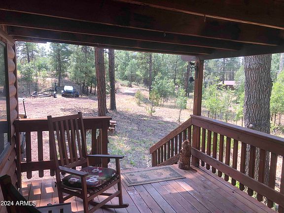 Beautiful log mountain escape on a secluded acre+ in the White Mountains. Home has 3 bedrooms, 1 bath, open concept, fireplace, large 360 sq ft covered redwood deck and a private deck and entrance from the primary bedroom. Large windows and sliding doors throughout remind you that you're truly in the forest. Lots of parking, a 12x12 Tuff Shed and its own separate RV site, electric hook-up only, on the property. From the deck you'll watch the deer run and play on your own private acre of tall Ponderosa pines and oaks. Excellent condition inside and out, Ready to move in. This is a rare opportunity to own this beautiful acre. The owners enjoyed this property as a vacation home for more than 35 years and are selling now to be closer to the new grandbaby out of state.